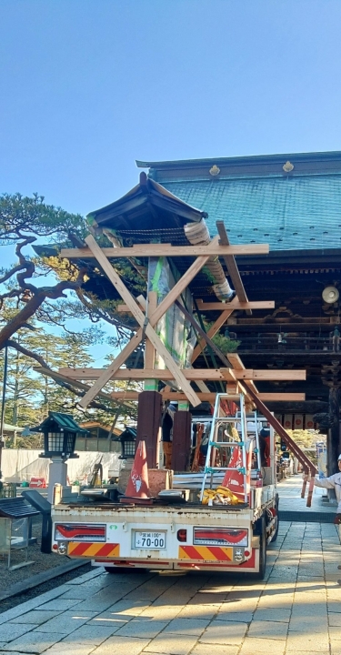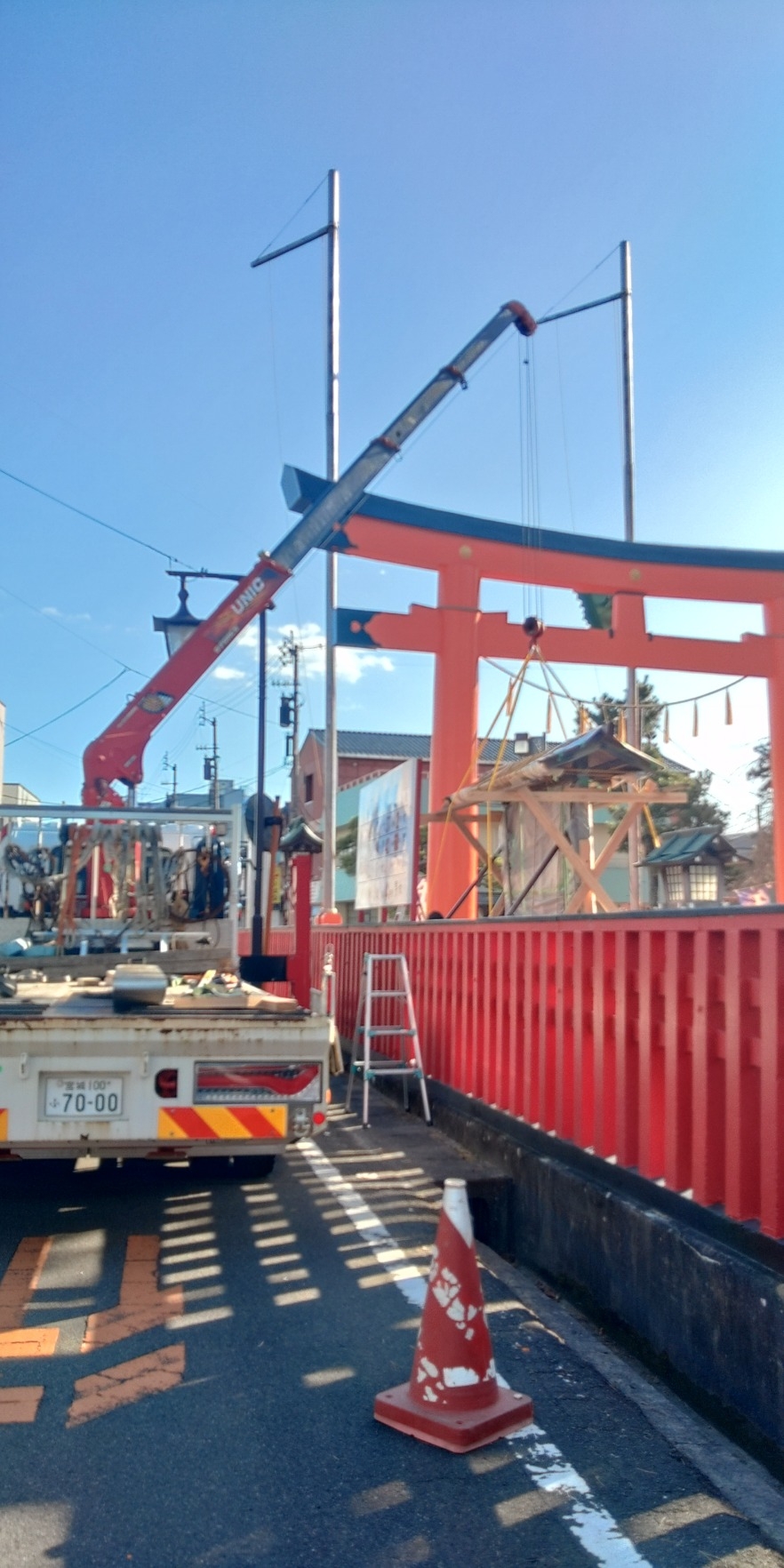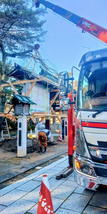 一日目は搬入と建て込みの作業。立派な鳥居のため柱だけでも約6m!上に乗る笠木は約9mになる為、運搬上半分に切っての搬入でした。敷地が狭い上足場が組んであったため、運送屋さんには路駐をしてもらい、部材一つ一つを慎重に敷地内へ移動。